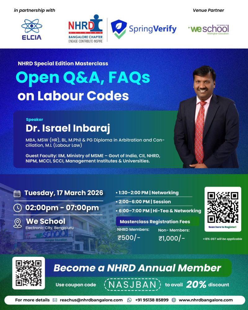 ELCIA is pleased to partner with NHRD Bangalore Chapter and SpringVerify for the NHRD Special Edition Masterclass — Decoding the Labour Codes. This focused masterclass aims to help HR and industry professionals navigate the evolving regulatory landscape under India’s new labour framework.