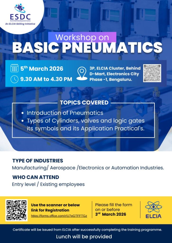 The ELCIA Skill Development Centre (ESDC) is organising a Workshop on Basic Pneumatics aimed at building foundational knowledge and practical understanding for industry professionals across key sectors.