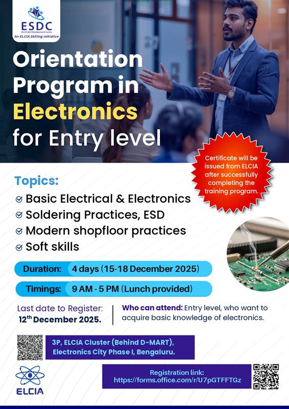 ELCIA Skill Development Centre (ESDC) is pleased to announce a 4‑day Orientation Program in Electronics, designed specifically for freshers seeking to build a strong foundation in the electronics industry. This initiative supports ELCIA’s commitment to empowering the Electronics City workforce through focused skilling and practical training.