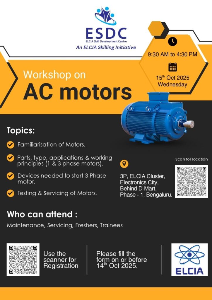 ELCIA Skill Development Centre (ESDC) is pleased to announce a hands‑on Workshop on AC Motors, designed for industry professionals, trainees, and maintenance teams looking to strengthen their understanding of motor systems used across industrial applications.